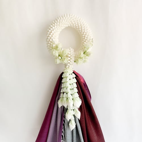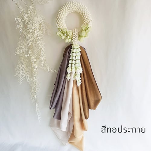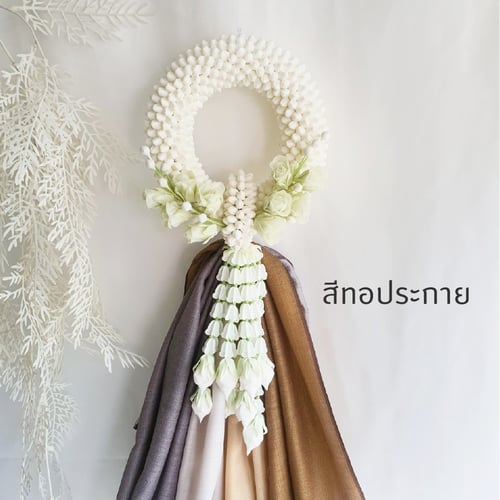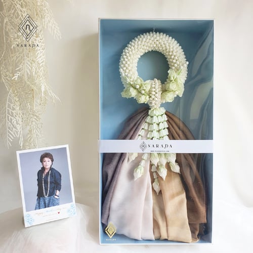 ผ้าพันคอ ผ้าคลุมไหล่ผืนสวย ร้อยเรียงพับเป็นพวงมาลัยขอพระกร ล้อมรอบด้วยดอกไม้ประดิษฐ์งานฝีมือคุณภาพชาววัง เป็นพวงมาลัยผ้าพวงสวย ปราณีต จัดใส่ในกล่อง พร้อมให้เป็นพวงมาลัยผ้าให้ผู้ใหญ่ในโอกาสต่างๆ