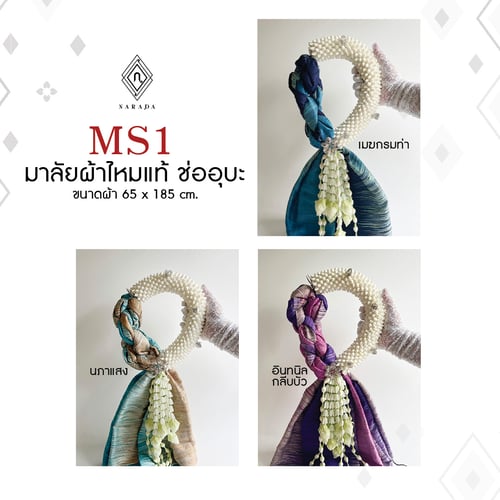 พวงมาลัยผ้าคลุมไหล่ชุดนี้พิเศษกว่าชุดอื่น เป็นมาลัยข้อพระกร ผ้าไหมชีฟอง ผูกเข้ากับผ้าคลุมไหล่ผืนสวย เมื่อแกะผ้าออกแล้ว ยังคงรูปมาลัยทีสวยงามได้อยู่
