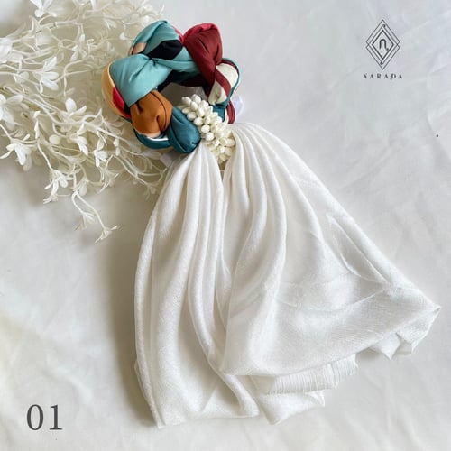 มาลัยผ้าผืนสวย ที่เป็นผ้าพันคอ ผ้าคลุมไหล่ ผืนใหญ่ เนื้อผ้าคุณภาพ พับเป็นรูปมาลัยทรงสวย ร้อยเรียงคู่กับดอกไม้ประดิษฐ์ที่สวยงาม ปราณีต บรรจง
