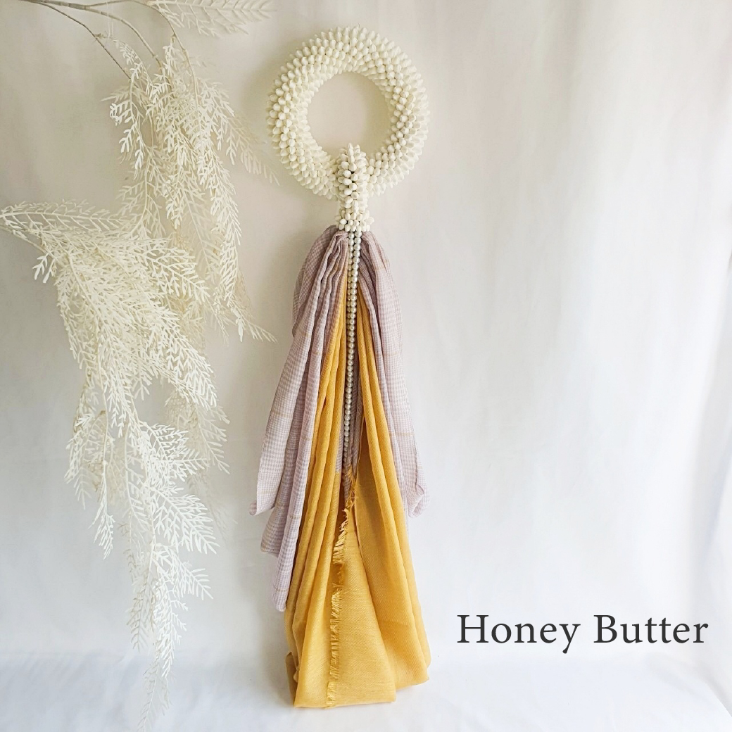 มาลัยผ้าผืนสวย ที่เป็นผ้าพันคอ ผ้าคลุมไหล่ ผืนใหญ่ เนื้อผ้าคุณภาพ พับเป็นรูปมาลัยทรงสวย ร้อยเรียงคู่กับดอกไม้ประดิษฐ์ที่สวยงาม ปราณีต บรรจง