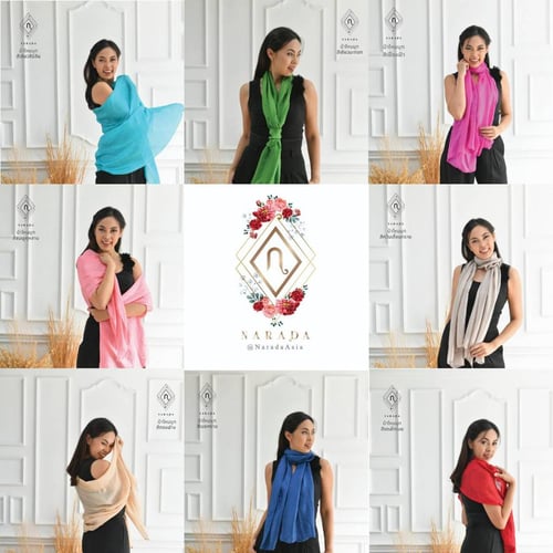 ผ้าพันคอ ผ้าคลุมไหล่ ผ้าไหมมุก แบรนด์ณราดา Narada เนื้อผ้าบางเบา แต่อบอุ่น เป็นผ้าไหมพิเศษที่ทอมาอย่างดี เหมาะสำหรับคลุมไหล่สวยๆ กับชุดราตรี หรือพันคอเก๋ หรือจะคลุมผมเป็นฮิญาบแบบชาวมุสลิมก็สวย จะเป็นผ้าคลุมศีรษะเก๋ๆ เวลาไปต่างประเทศก็เหมาะมาก ด้วยโทนสีมากกว่า 20 โทนสีให้เลือกสรร เนื้อผ้ามีน้ำหนักเบา สามารถพกไปเป็นพร๊อพถ่ายรูปที่ต่างประเทศได้อย่างสนุกสนาน หรือ จะให้เป็นของขวัญใครๆก็ถูกใจ โดยเฉพาะของขวัญให้ผู้ใหญ่ ของขวัญสำหรับโอกาสต่างๆ เช่น ของขวัญวันเกิด ของขวัญให้แฟน ของขวัญปีใหม่ ของขวัญจับฉลาก ของขวัญวันแม่ ของขวัญให้ผู้ใหญ่ ของขวัญวันเกษียณ ของขวัญเปิดภาคการศึกษาสำหรับคอร์สเรียนต่างๆ