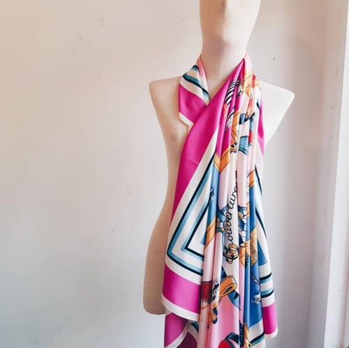 เป็นผ้าไหมผสมโพลีเอสเตอร์  ที่มีดีไซน์สวยงาม หรูหรา ได้แรงบันดาลใจจากผ้าพันคอแบรนด์แฟชั่นดังๆเช่น จากผ้าพันคอ Hermes, Gucci, Louis Vitton, Fendi, Burberry, Zara สามารถคลุมไหล่ สวย พันคอ เก๋ๆ เป็นผ้าพันคอที่ทำเป็นเสื้อ เกาะอก เป็นผ้าพันคอเสื้อไหล่เดียว พันไปงานเก๋ๆ ผ้าพันคอคลุมชายหาด ผืนใหญ่ สามารถกันแดด กันลม เวลาไปทะเล ปูผ้าที่ชายหาด สารพัดประโยน์ หรือเป็นผ้าพันคอคลุมศีรษะ โบฮิเมียม เป็นฮิปเสดร์
