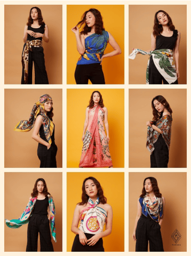 เป็นผ้าไหมผสมโพลีเอสเตอร์  ที่มีดีไซน์สวยงาม หรูหรา ได้แรงบันดาลใจจากผ้าพันคอแบรนด์แฟชั่นดังๆเช่น จากผ้าพันคอ Hermes, Gucci, Louis Vitton, Fendi, Burberry, Zara สามารถคลุมไหล่ สวย พันคอ เก๋ๆ เป็นผ้าพันคอที่ทำเป็นเสื้อ เกาะอก เป็นผ้าพันคอเสื้อไหล่เดียว พันไปงานเก๋ๆ ผ้าพันคอคลุมชายหาด ผืนใหญ่ สามารถกันแดด กันลม เวลาไปทะเล ปูผ้าที่ชายหาด สารพัดประโยน์ หรือเป็นผ้าพันคอคลุมศีรษะ โบฮิเมียม เป็นฮิปเสดร์