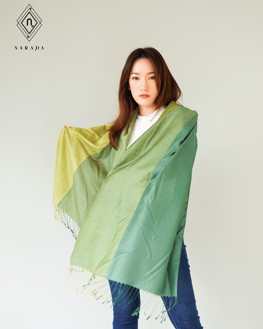 ผ้าคลุมไหล่ ผ้าพันคอรูปแบบใหม่ มาในรูปแบบผ้าคลุมไหล่ผืนยาว สี่เหลี่ยมจตุรัส ขนาด 80x170 ซม. เป็นผ้าคลุมไหล่ ที่ทอจากใยไหม 4 สี เหมือนดูหน้าหลัง จะเสมือนมี 8 สี ในผืนเดียว ใหม่ ไม่เหมือนใคร เป็นผ้าพันคอ ผ้าคลุมไหล่ ที่มีเส้นใยอะไครลิกผสมโพลีเอสเตอร์ ให้ความอบอุ่น หนาปานกลาง จึงสามารถใช้คลุมไหล่ในช่วงอากาศเย็นสบาย หรือใช้เป็นพันคอเก๋ๆ สร้างสีสันให้กับการแต่งตัว เหมาะกับอากาศในเมืองไทย หรือจะพกพาไปต่างประเทศ เป็นผ้าพันคอ ผ้าคลุมไหล่ที่ดูแลรักษาง่าย สามารถให้เป็นของขวัญผ้าพันคอ ของขวัญผ้าคลุมไหล่ ในโอกาสต่างๆ เช่นของขวัญปีใหม่ ของขวัญวันเกิด ของขวัญให้แฟน ของขวัญให้ผู้ใหญ่ ของขวัญวันเกษียณ มี 12 เฉดสีให้เลือก