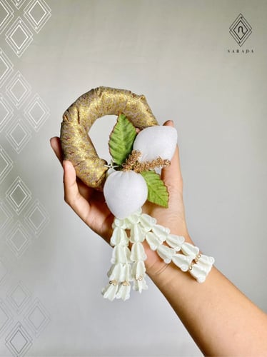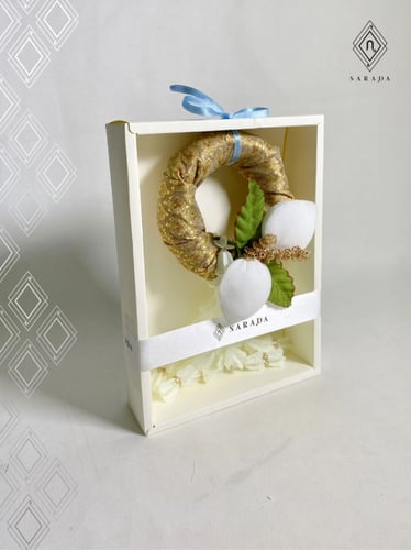 - มาลัยผ้าไทย กลีบการบูร มีกลิ่นหอม (สีทอง) ขนาด 9 x 17 cm.
