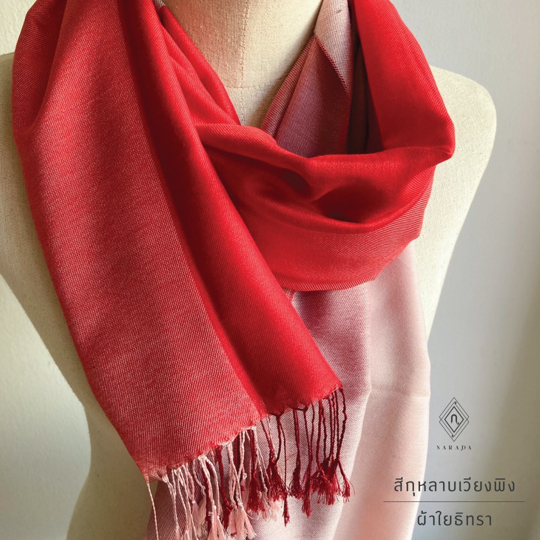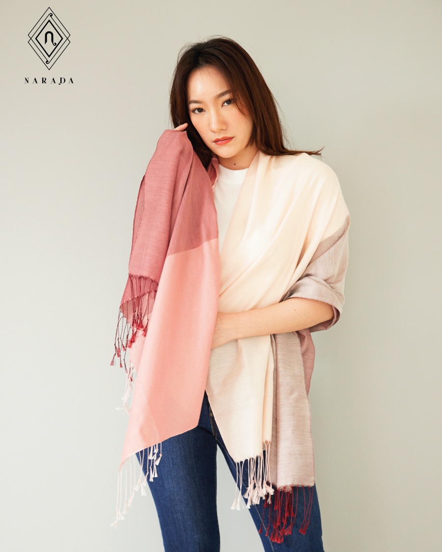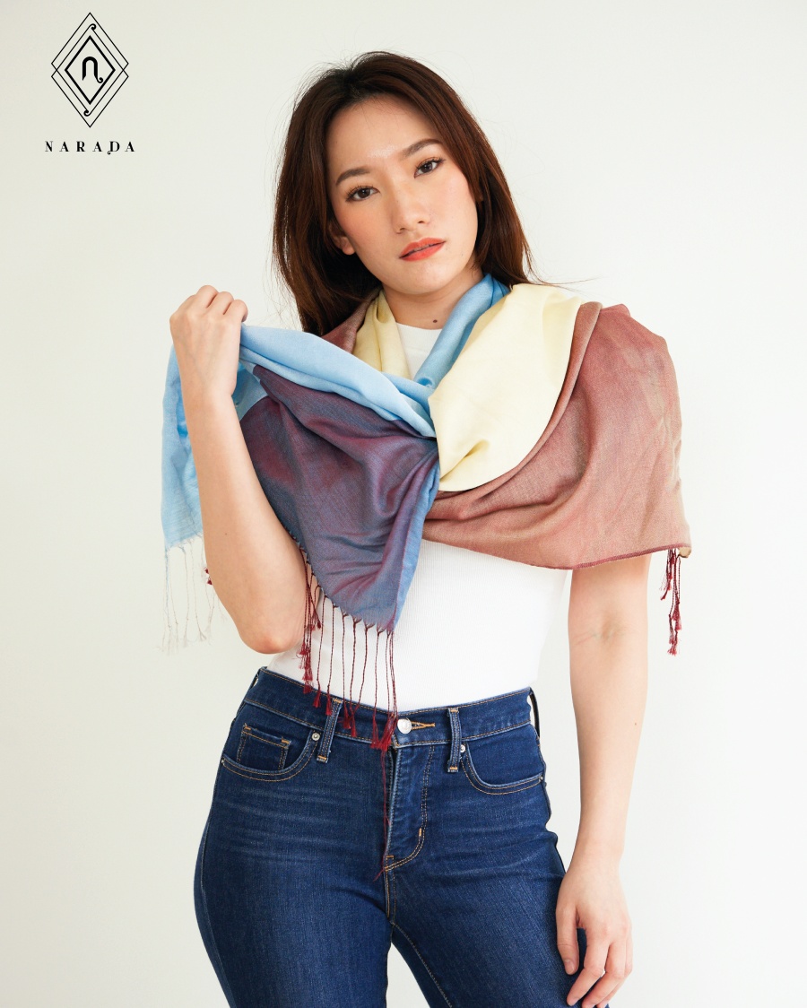 - ผ้าคลุมไหล่ผืนสวยทอจากใยไหม 4 สีใน 1 ผืน หน้าหลังเฉดเข้มอ่อน ทำให้ได้โทนสีถึง 8 โทนที่อยู่ด้วยกันอย่างลงตัว