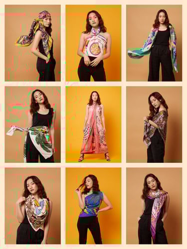 เป็นผ้าไหมผสมโพลีเอสเตอร์  ที่มีดีไซน์สวยงาม หรูหรา ได้แรงบันดาลใจจากผ้าพันคอแบรนด์แฟชั่นดังๆเช่น จากผ้าพันคอ Hermes, Gucci, Louis Vitton, Fendi, Burberry, Zara สามารถคลุมไหล่ สวย พันคอ เก๋ๆ เป็นผ้าพันคอที่ทำเป็นเสื้อ เกาะอก เป็นผ้าพันคอเสื้อไหล่เดียว พันไปงานเก๋ๆ ผ้าพันคอคลุมชายหาด ผืนใหญ่ สามารถกันแดด กันลม เวลาไปทะเล ปูผ้าที่ชายหาด สารพัดประโยน์ หรือเป็นผ้าพันคอคลุมศีรษะ โบฮิเมียม เป็นฮิปเสดร์