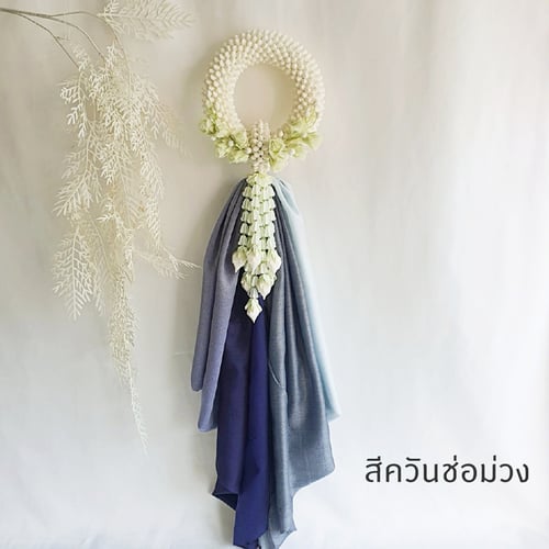 ผ้าพันคอ ผ้าคลุมไหล่ผืนสวย ร้อยเรียงพับเป็นพวงมาลัยขอพระกร ล้อมรอบด้วยดอกไม้ประดิษฐ์งานฝีมือคุณภาพชาววัง เป็นพวงมาลัยผ้าพวงสวย ปราณีต จัดใส่ในกล่อง พร้อมให้เป็นพวงมาลัยผ้าให้ผู้ใหญ่ในโอกาสต่างๆ