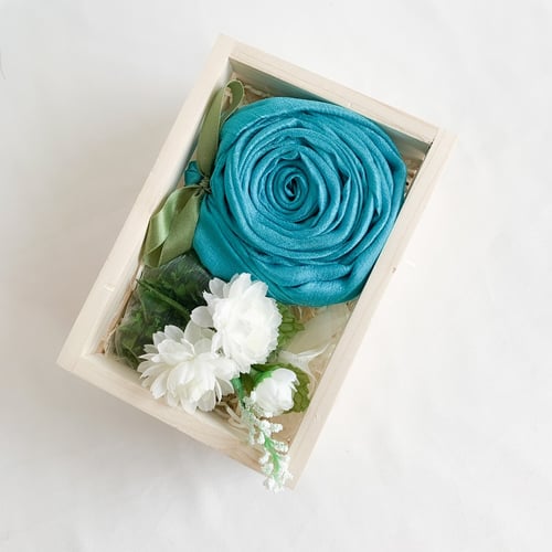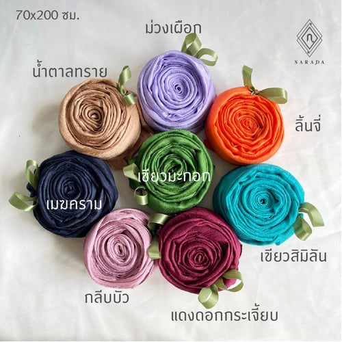 ผ้าพันคอ ผ้าคลุมไหล่ผืนสวย ผ้าไหมมุกม้วนเป็นกุหลาบ พร้อมกับถุงบุหงาประดับด้วยเข็มกลัดช่อดอกมะลิ