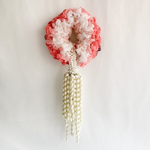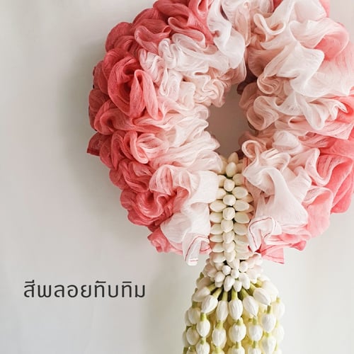 ผ้าพันคอ ผ้าคลุมไหล่ผืนสวย ร้อยเรียงพับเป็นพวงมาลัยขอพระกร ล้อมรอบด้วยดอกไม้ประดิษฐ์งานฝีมือคุณภาพชาววัง เป็นพวงมาลัยผ้าพวงสวย ปราณีต จัดใส่ในกล่อง พร้อมให้เป็นพวงมาลัยผ้าให้ผู้ใหญ่ในโอกาสต่างๆ