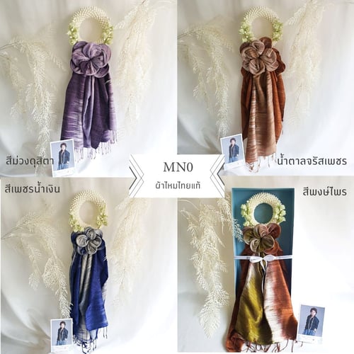ผ้าพันคอ ผ้าคลุมไหล่ผืนสวย ร้อยเรียงพับเป็นพวงมาลัยขอพระกร ล้อมรอบด้วยดอกไม้ประดิษฐ์งานฝีมือคุณภาพชาววัง เป็นพวงมาลัยผ้าพวงสวย ปราณีต จัดใส่ในกล่อง พร้อมให้เป็นพวงมาลัยผ้าให้ผู้ใหญ่ในโอกาสต่างๆ