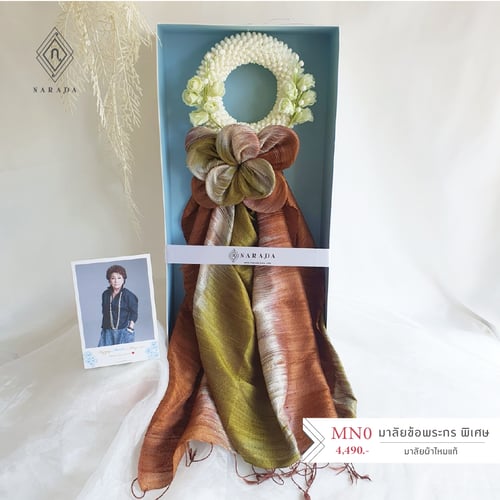 ผ้าพันคอ ผ้าคลุมไหล่ผืนสวย ร้อยเรียงพับเป็นพวงมาลัยขอพระกร ล้อมรอบด้วยดอกไม้ประดิษฐ์งานฝีมือคุณภาพชาววัง เป็นพวงมาลัยผ้าพวงสวย ปราณีต จัดใส่ในกล่อง พร้อมให้เป็นพวงมาลัยผ้าให้ผู้ใหญ่ในโอกาสต่างๆ