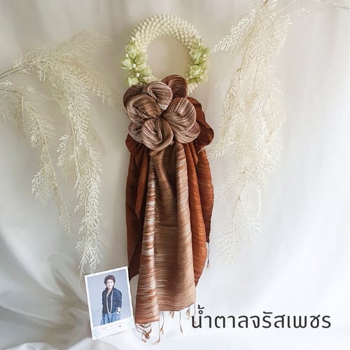 ผ้าพันคอ ผ้าคลุมไหล่ผืนสวย ร้อยเรียงพับเป็นพวงมาลัยขอพระกร ล้อมรอบด้วยดอกไม้ประดิษฐ์งานฝีมือคุณภาพชาววัง เป็นพวงมาลัยผ้าพวงสวย ปราณีต จัดใส่ในกล่อง พร้อมให้เป็นพวงมาลัยผ้าให้ผู้ใหญ่ในโอกาสต่างๆ