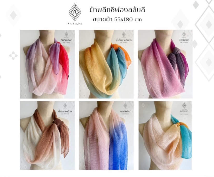 ทุกสีสามารถเลือกเป็น ผ้าคลุมไหล่, มาลัยผ้าพันคอ, หรือ ผ้าพันคอพรีเมียมลายไทย ได้ตามสไตล์ผู้รับ